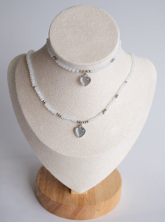 White Heart Beaded Necklace and Bracelet Set